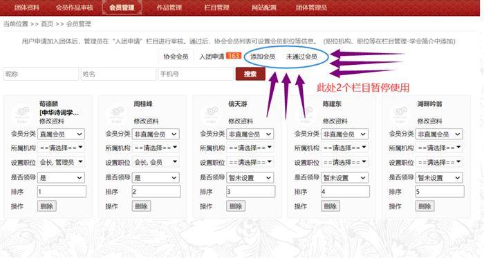 备注:原“添加会员”“未通过会员”栏目暂停使用,恢复时间另行通知。