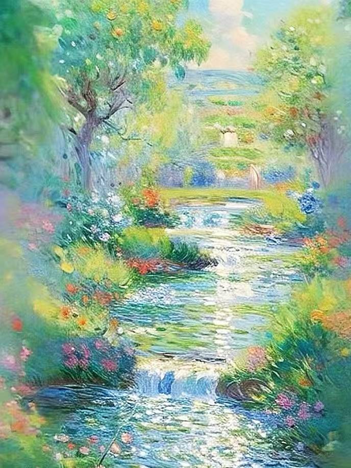 在为这首词寻求视觉诠释时,传统水墨的写意风格因其过于抽象难以传达词中光影交错的质感,实景照片又因太过写实无法表现"透明风"这般超验意象。唯独类似印象派的创作手法——那些用色点表现光影变化的作品,与词中意象产生了深层次的共鸣。