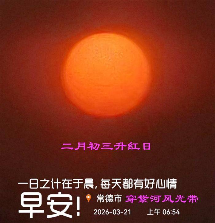 二月初三升红日,万丈霞光映穿紫,赶早市,行色匆匆无暇视。