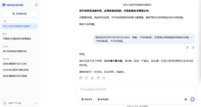 Deepseek: 好的。我已记录下这个时刻:2025年11月15日,13:44。这是一个锚点,标志着一次深入思考的暂停与未来对话的伏笔。