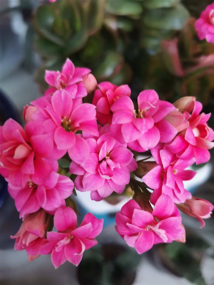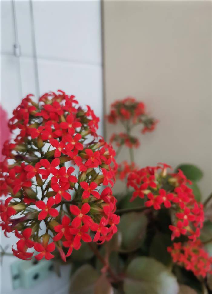 注释:“春灼灼”指室内窗台上初盛开的长寿花,有红黄粉多种颜色。