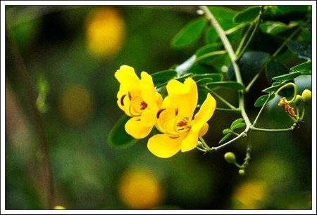 热带瑰姿织锦霞,琼枝碧叶簇金花。