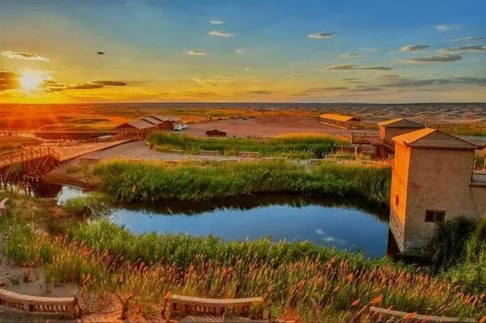 苍茫大漠下,清波寻韵雅。古居延泽映朝霞。