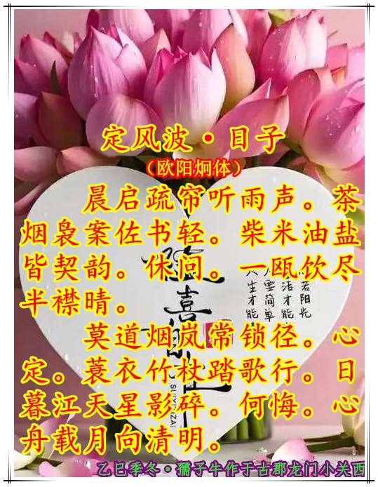 莫道烟岚常锁径。心定。蓑衣竹杖踏歌行。日暮江天星影碎。何悔。心舟载月向清明。