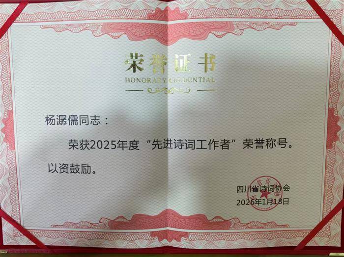 非常感谢协会将这份珍贵的荣誉授予我。在这里,我深感荣幸,更心怀忐忑。这份表彰,与其说是对我个人点滴工作的肯定,不如说是对我们乐山市诗词楹联学会全体同仁长期以来耕耘不辍、守望诗心的集体褒奖。在此,请允许我向大家致以最诚挚的谢意。