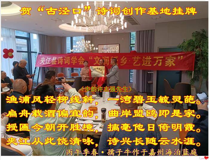 附:许志强原韵 古泾口外酒旗斜,四月春风润万葩。 一网江渔堪入韵,八方吟友喜安家。 授牌今日开新境,对酌明朝醉夕霞。 从此骚坛添胜事,纵情飞过水之涯。