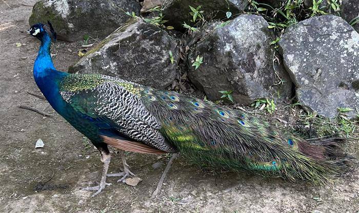 注释:因所拍手机像数高,开屏孔雀的照片不能上传;故将未开屏孔雀照片,裁剪掉一半多风景,才上传了此照片。