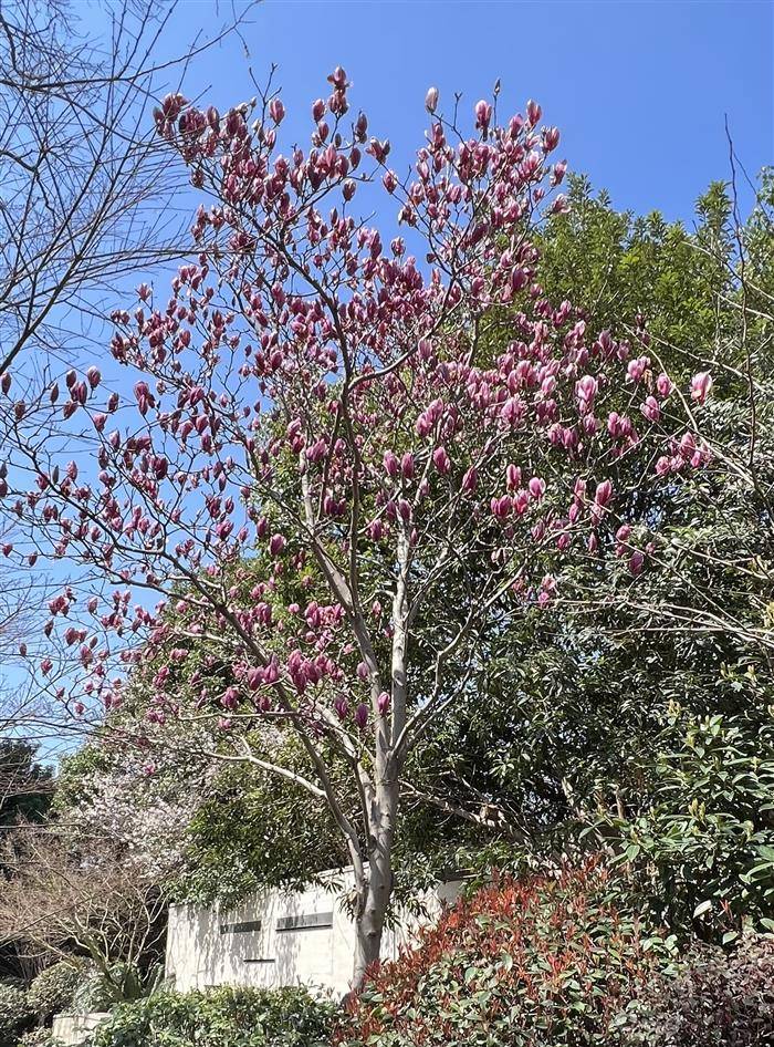 注释:红玉兰(通常指紫玉兰,学名:Yulania liliiflora,别名辛夷、木笔)是木兰科玉兰属的落叶灌木或小乔木,是中国特有的传统名贵花卉。其花色艳丽,外轮花瓣呈紫红色或深紫色,内轮颜色稍淡,有时带白色。花型大,呈钟状或瓶状,直立生于枝顶。它是典型的“先花后叶”或花叶同放。在早春叶子还没长出来或刚萌发时,花朵便已绽放,满树紫红,非常壮观。树皮灰褐色,小枝常呈绿紫色或淡褐紫色。叶片椭圆状倒卵形。红玉兰通常在2月至3月开花,部分晚花品种或地区可延续至4月。原产于中国中部及南部地区(如陕西、福建、重庆、云南等),现广泛栽培于中国各地园林及庭院中。花语:高洁、真挚的爱、芳香情思、吉祥如意。象征意义:富贵吉祥(常与海棠、牡丹搭配种植,取“玉堂富贵”之意,“玉”指玉兰,“堂”指海棠,“富”指牡丹)、报恩与忠贞(象征着纯洁的爱情和对长辈的感恩之情)、生命力(因其在乍暖还寒的早春独自开放,也象征着坚韧不拔和顽强的生命力)。