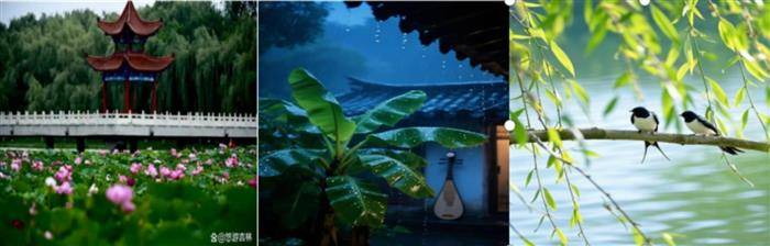 田田莲动花窗,盈盈波映霞光,阵阵歌环秀廊。湖边街巷,开轩荷下乘凉。