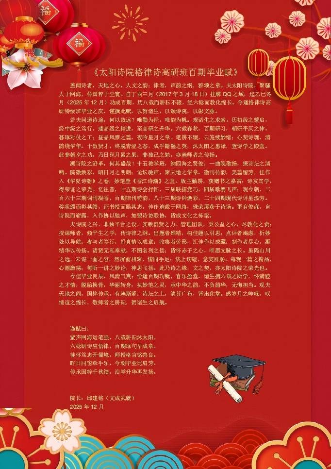 盖闻诗者,天地之心,人文之韵;律者,声韵之纲,雅颂之章。夫太阳诗院,聚骚人于网海,传国粹于尘寰。自丁酉三月(2017年3月18日)挂牌QQ之域,迄乙巳冬月(2025年12月)功成百期,历八载而耕耘不辍,经六稔而教化绵长。今逢格律诗高研特级班毕业之庆,谨撰此赋,以贺诸生,以颂诗院,以彰文脉。