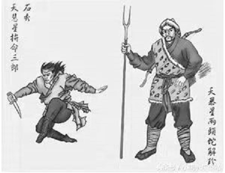 石秀:外号拚命三郎、江南人氏,自幼父母双亡,流落蓟州卖柴度日,有一身好武艺,又爱打抱不平。一百零八将之一,梁山好汉排座次时第三十三位。在征讨方腊时与史进、杨春等六人在昱岭关被方腊帐下大将庞万春射杀,死后追封“忠武郎”。他的英勇事迹《智杀裴如海》、《大闹翠屏山》、《探祝家庄》等通过评书、戏曲等方式在民间广为流传。(简介摘录百度百科)2019、11、26