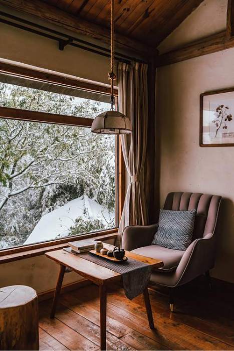 围炉阁暖入茶座,街巷飞花雪絮扬。