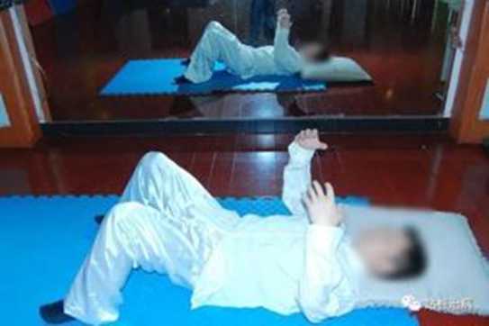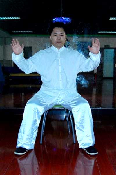 注释:三圆站式:两腿自然站立,与肩同宽,两足尖适当内收站成—半圆形(第一圆)。脚底着地踏平,两膝顶着足尖方向微微弯曲。两手臂分别向前伸展,肘关节弯屈呈抱树状(第二圆)。肩关节自然伸展,微垂勿耸起,肘关节比肩稍低一些。两手掌相对,其距离与肩同宽,高低与乳头相平或稍低一些。两手手指微微弯曲成球状(第三圆)。头与上体保持端正,含胸拔背,沉肩垂肘,脊柱维持自然的生理曲线。