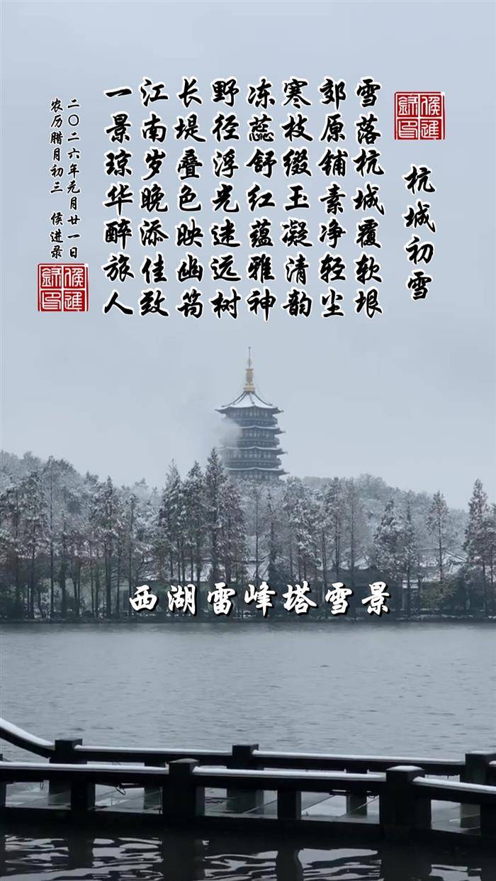 此篇为七言律诗,以杭城初雪为吟咏核心,循由城及郊、由近及远的视角铺展江南雪色,绘寒枝冻蕊、野径长堤的雅致景致,末句融旅人之情于景,将江南岁晚的初雪佳致与行路游人的沉醉之感相融。全诗景清韵雅,炼字精工,紧扣杭城温婉的江南地域特质,景情相融无间,画面与意境兼具。
