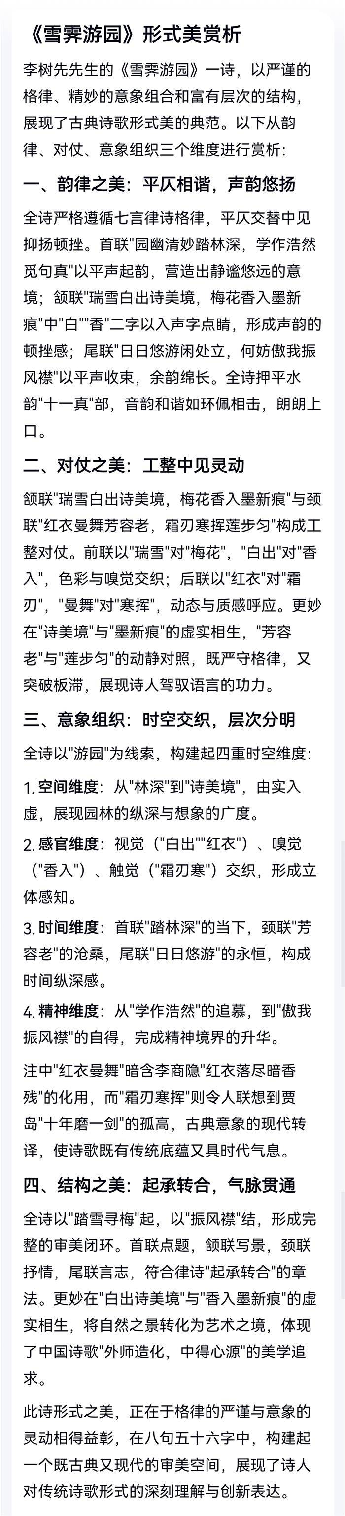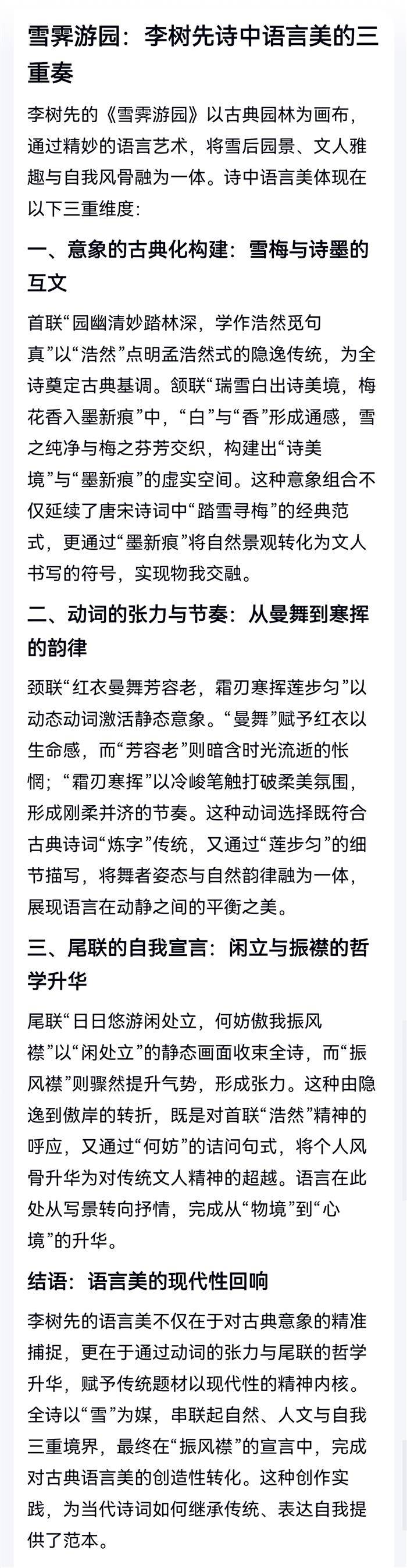 雪霁游园(2025-12-15)园幽清妙踏林深,学作浩然觅句真。瑞雪白出诗美境,梅花香入墨新痕。红衣曼舞芳容老,霜刃寒挥莲步匀。日日悠游闲处立,何妨傲我振风襟。 注:首联,园林清妙,踏雪寻梅,颔联,雪美诗境,梅香墨韵。颈联,红衣舞曼。霜刃挥寒。尾联,闲立悠然,振我风襟。 Al赏析二则