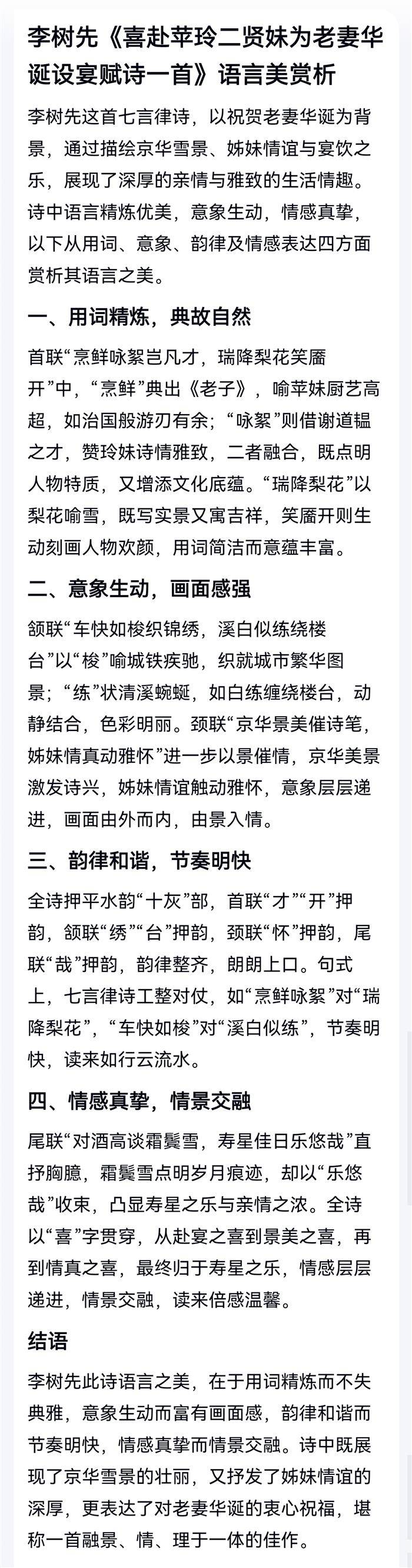 注:首联,苹妹厨艺烹鲜,玲妹诗才咏絮,正当时维京华瑞雪。颔联,路上城铁如梭织锦绣,清溪似白练绕楼台。颈联,京华景美催诗,姊妹情真感怀。尾联,爱妻华诞,亲情浓浓。