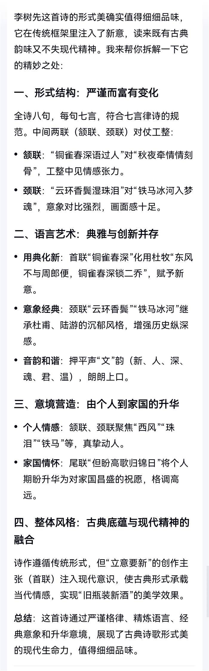 注:首联,立意要新,如杜牧诗。铜雀春深,引杜牧诗意,东风助吴,二乔幸免一劫。此谓出语惊人。雀台,铜雀台。颔联,感情要真。西风吹妾,妾先忧夫。引唐人句意。颈联,语境要美。引杜甫,陆游句意。尾联,格调要高。家国情怀,先国后家。