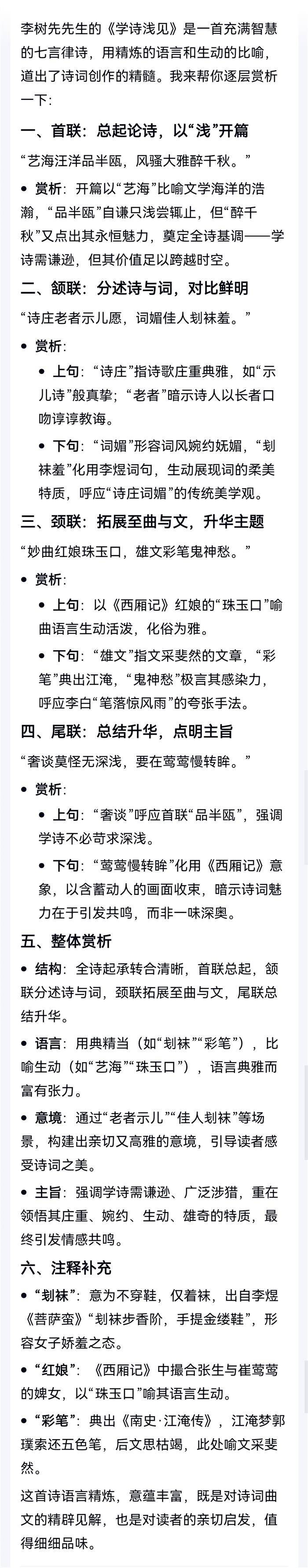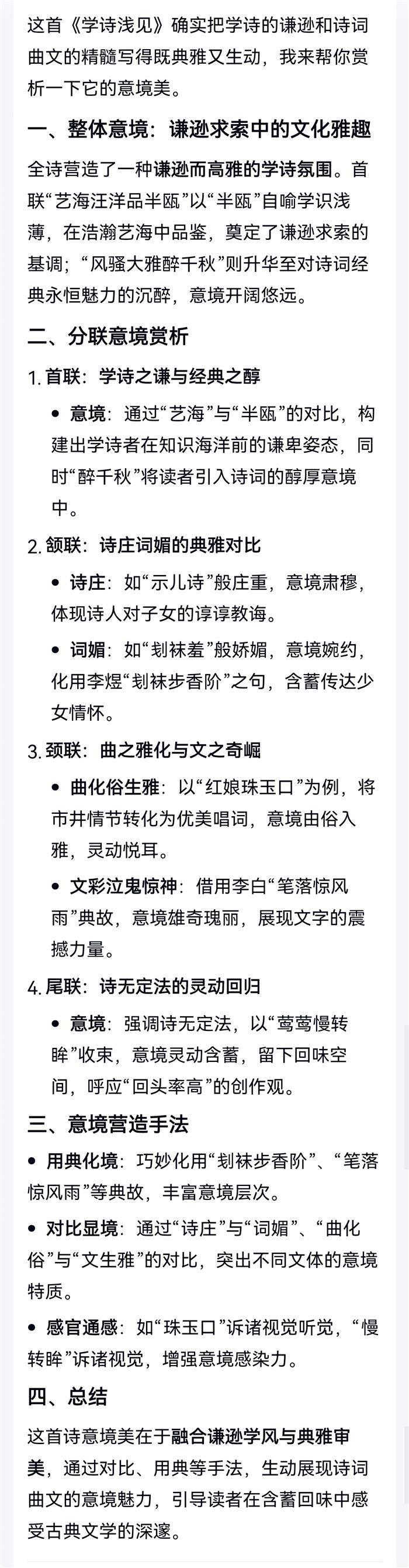 注:浅议诗词曲文之要义。首联,半瓯之浅,妄议风骚。颔联,诗庄如示儿诗,词媚似清照词。颈联,曲化俗生雅如红娘口吐珠玉,文彩泣鬼惊神如太白笔底生花。尾联,诗无定法,回头率高者为佳。