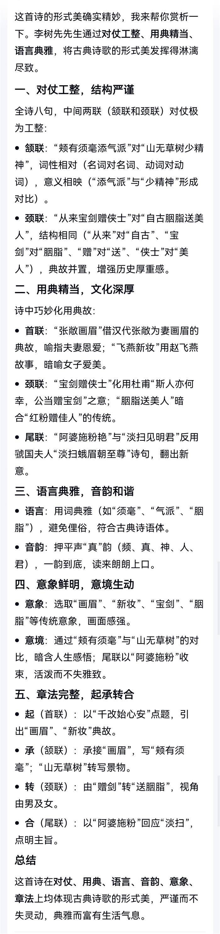 注:首联,张敞画眉,飞燕新妆。引张敞,飞燕故事。颔联,颊外添毫,山中有树。引相关典故,背景资料。颈联,义士佩剑,美人严妆。尾联,老太春心,粉艳娇人。引袁枚,相关虢国夫人诗句意。