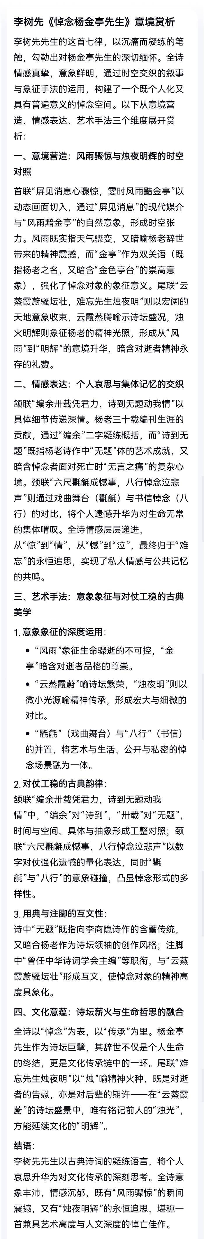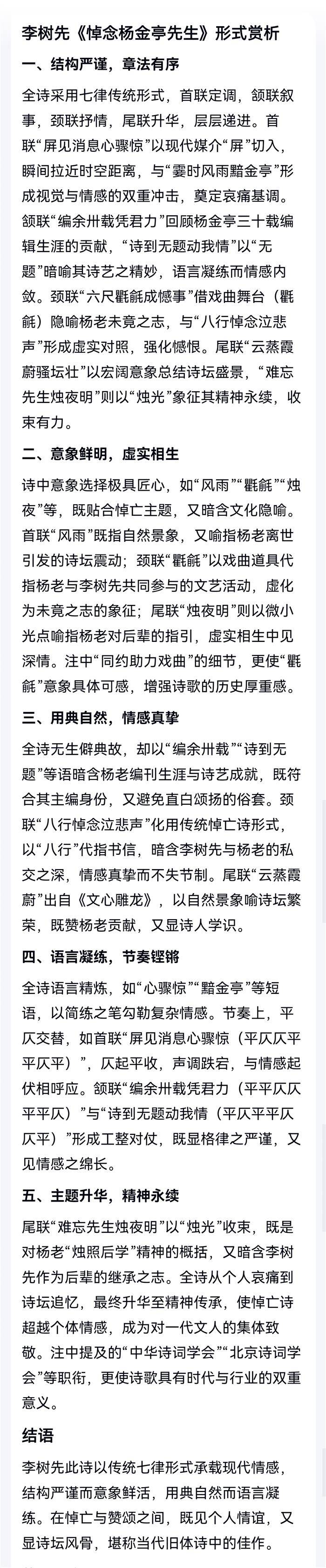 注:首联,噩耗堪悲,杨老辞世。金亭,杨金亭先生。颔联,中华编刊,诗情动我。颈联,同约助力戏曲,而今己成憾事。尾联,诗坛盛况,难忘先生。