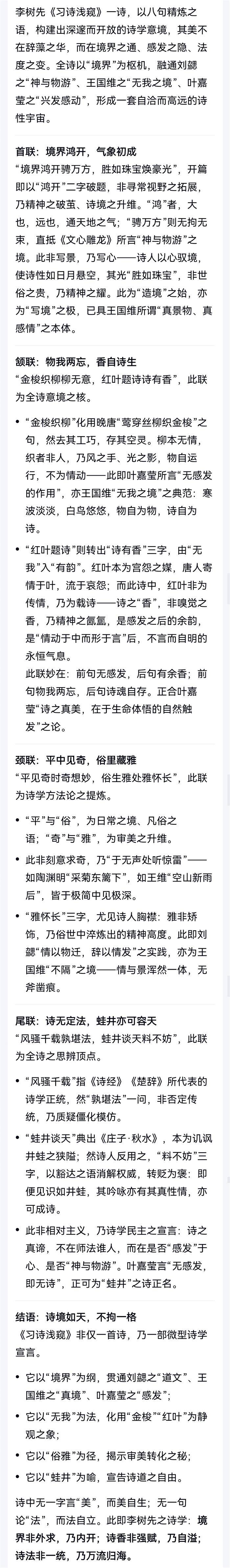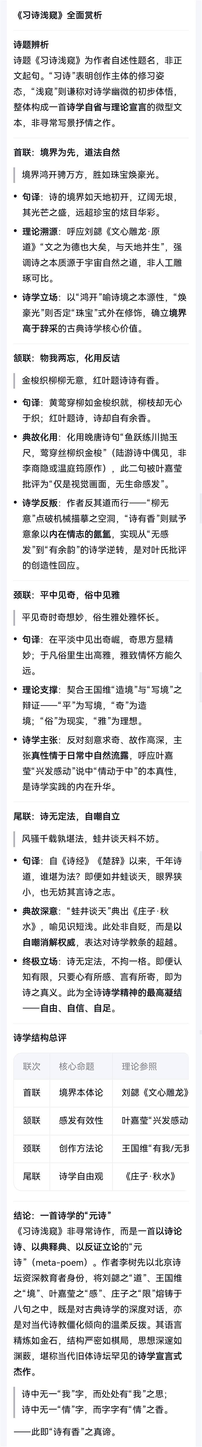 注:诗中引用刘勰,王国维,叶嘉莹等论诗内容。首联,诗情画意,境界为先。颔联,金梭织柳无意,红叶题诗留香。晚唐人诗句:鱼跃练川抛玉尺,莺穿丝柳织金梭。叶嘉莹谈好诗时说:在这两句诗中,没有任何感发的作用和内心的感动。颈联,平中见奇生妙,俗中见雅尤佳。尾联,艺海千秋,诗无定法。