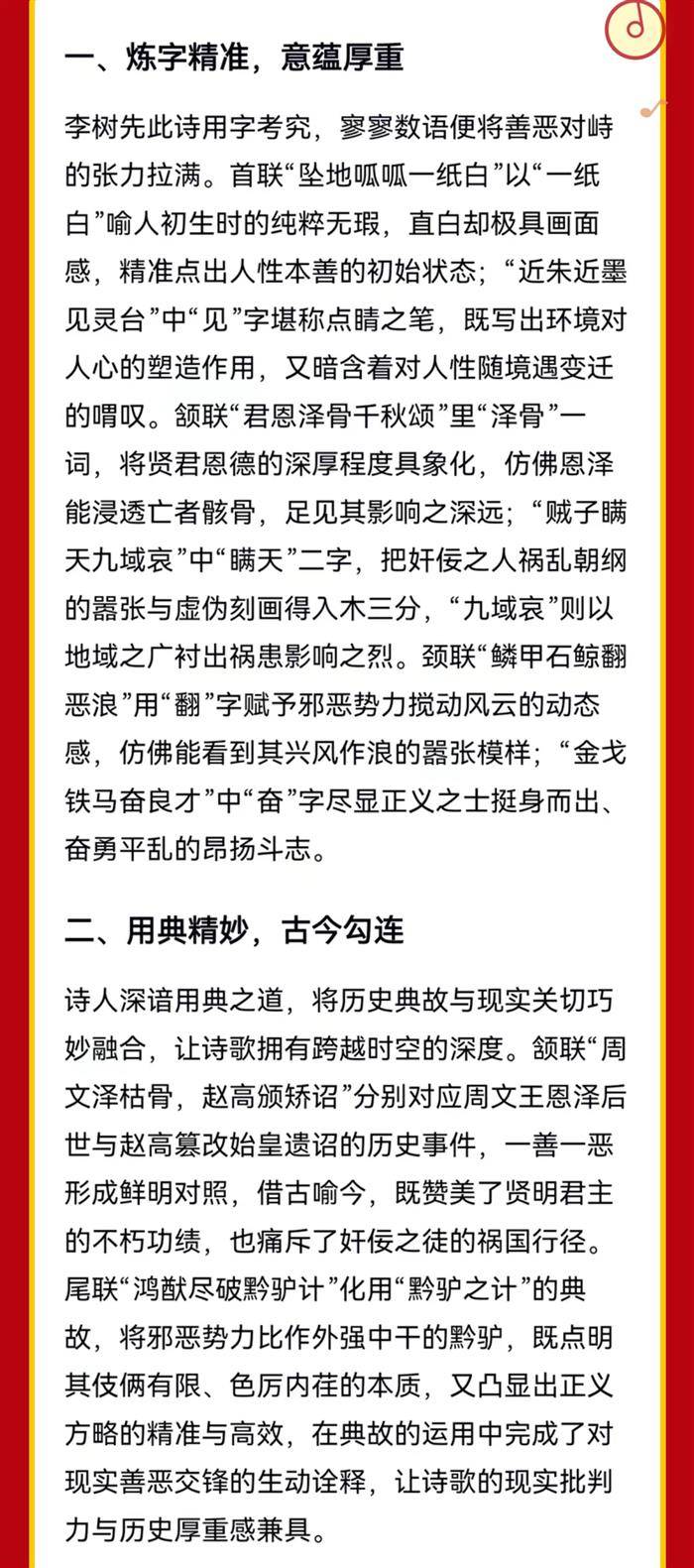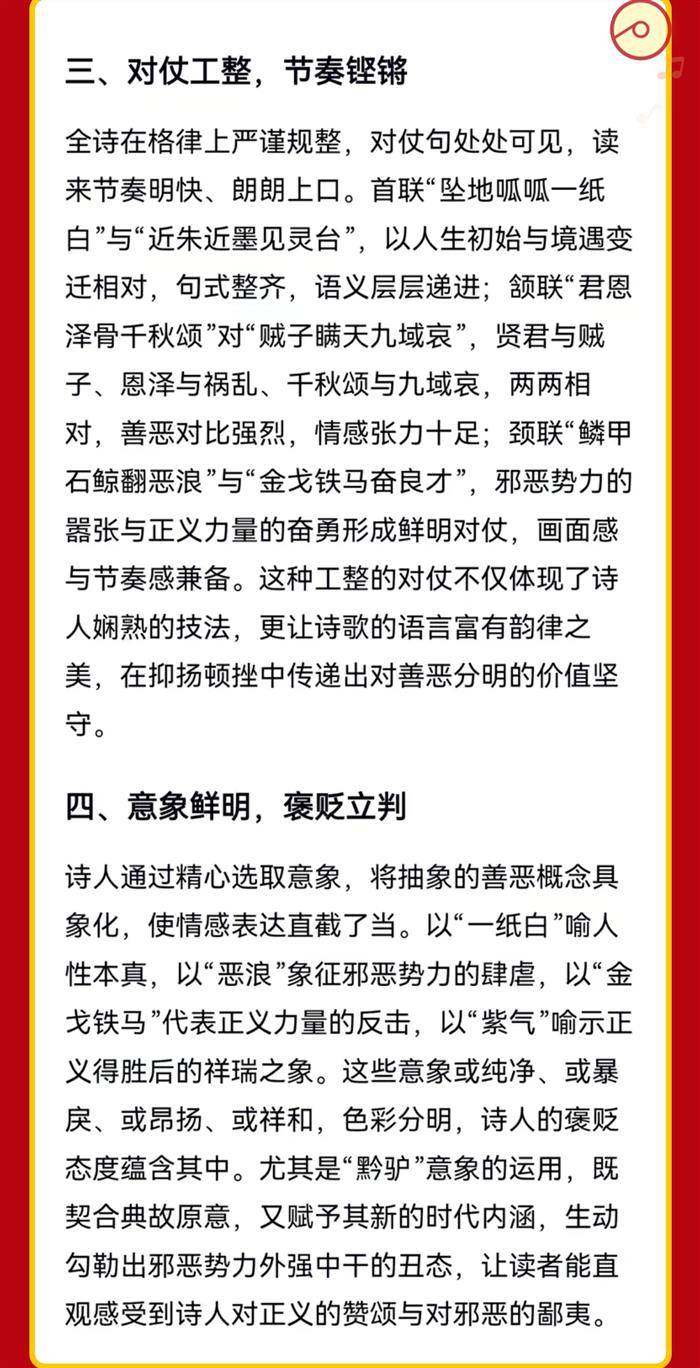 注:此诗以世间善恶为主题,以中国历史及时事网闻消息为背景资料。首联,人初无善恶,朱赤染灵台(指心)。颔联,周文泽枯骨,赵高颁矫诏。颈联,邪恶兴风浪,正义扫残敌。尾联,鸿猷破驴计,紫气满神州。