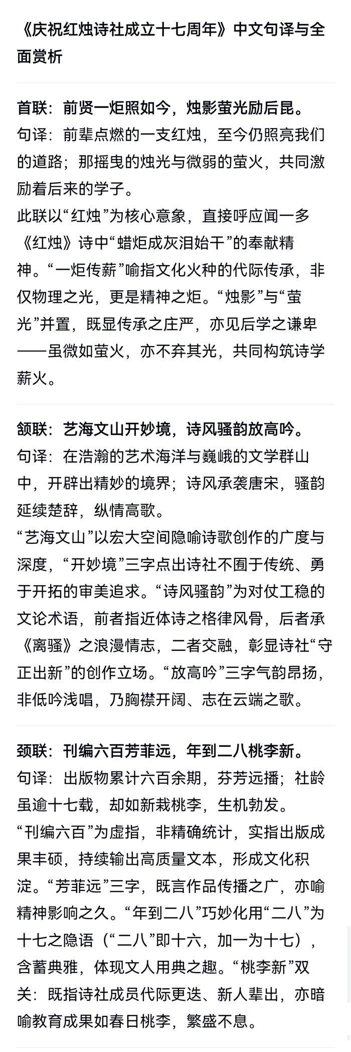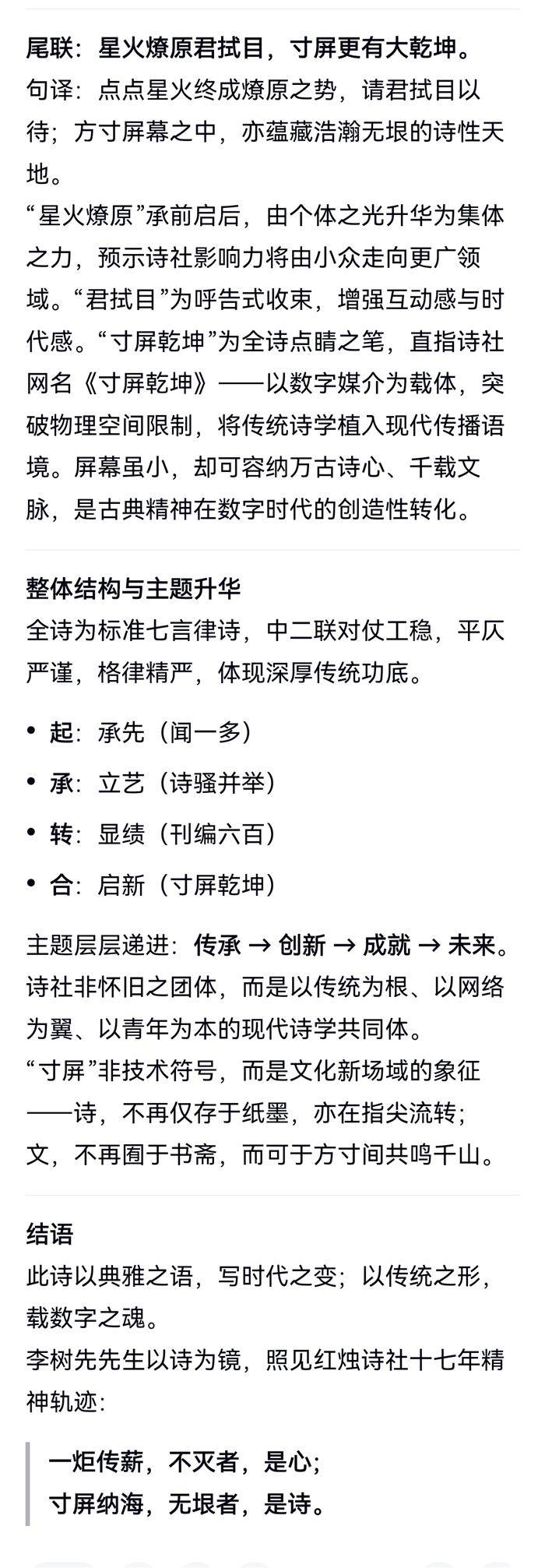 注:首联,前贤烛火,一炬传薪。前贤,闻一多曾《红烛》诗。颔联,艺文境妙,诗骚吟高。颈联,刊编六百,社令十七。六百,大概数字。过二八,此指建社十七年。尾联,星火燎原,寸屏乾坤。寸屏,引诗社网名《寸屏乾坤》。