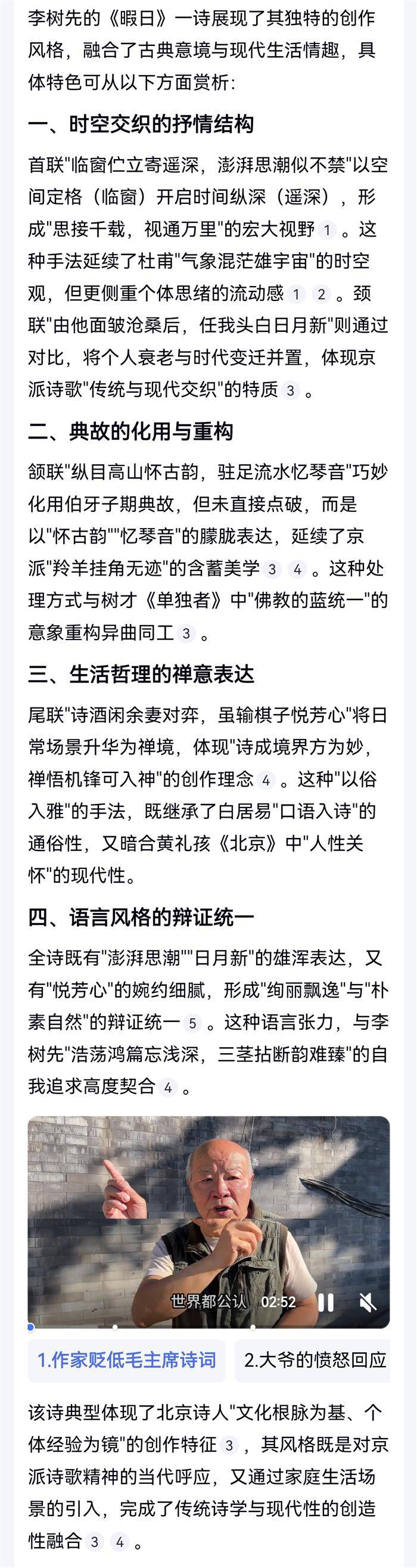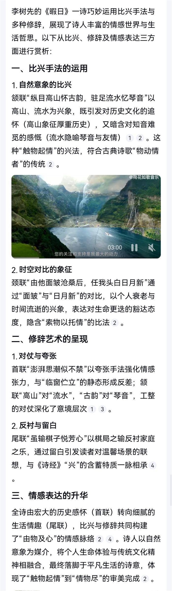暇 日(2025-10-5)临窗伫立寄遥深,澎湃思潮似不禁。纵目高山怀古韵,驻足流水忆琴音。由他面皱沧桑后,任我头白日月新。诗酒闲余妻对弈,虽输棋子悦芳心。 注:首联,思接千载,视通万里。颔联,高山流水,知音安在?颈联,年华老去,岁月日新。尾联,与妻闲弈,其乐融融。 Al赏析二则