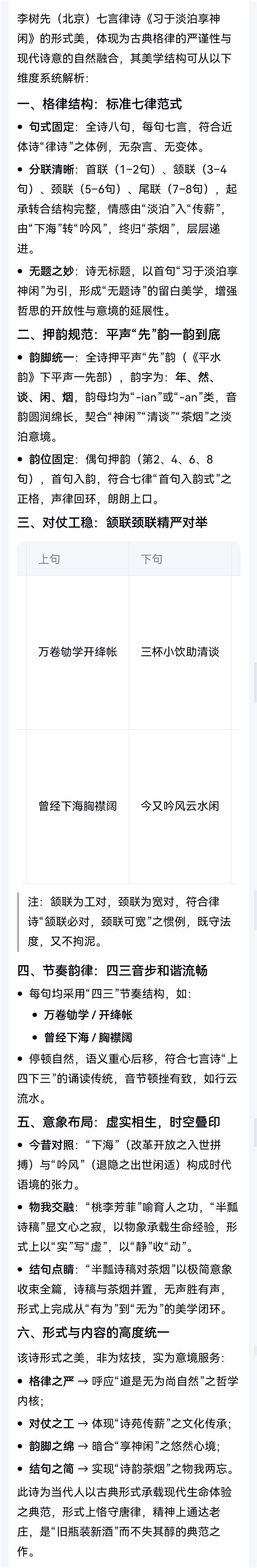注:首联,淡泊人生,无憾无惊。颔联,诗苑传薪,樽前待友。颈联,上山下海,乘风破浪。尾联,桃繁李盛,诗韵茶烟。