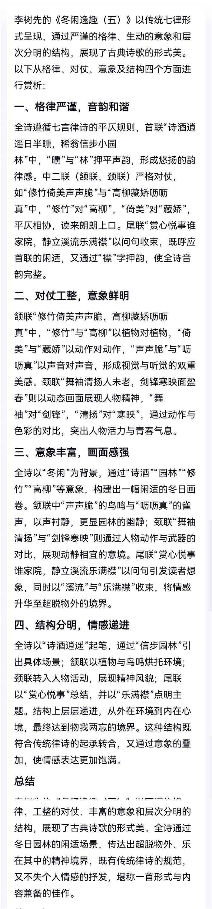 :首联,诗酒逍遥,信步园林。颔联,倚竹人唱,藏柳雀鸣。颈联,舞袖清扬,剑锋寒映。尾联,赏心悦事,其乐盈襟。