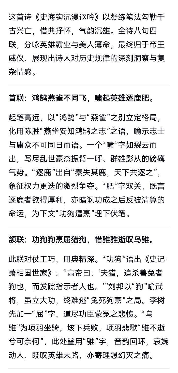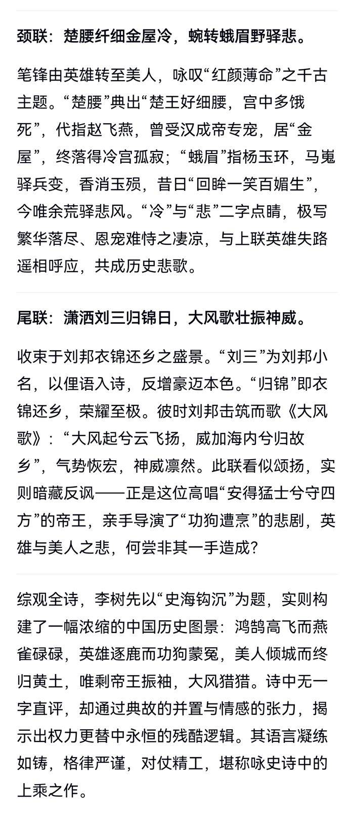 注:英雄逐鹿,红颜薄命。首联,鸿燕不同,英雄逐鹿。颔联,功狗遭烹,乌雅已逝。屠狗,引韩信羞与樊哙为伍。乌骓,引项羽垓下歌。颈联,飞燕金屋冷,玉环马嵬悲。野驿,指马嵬驿。尾联,刘邦称帝,衣锦还乡。刘郎,此指刘邦。