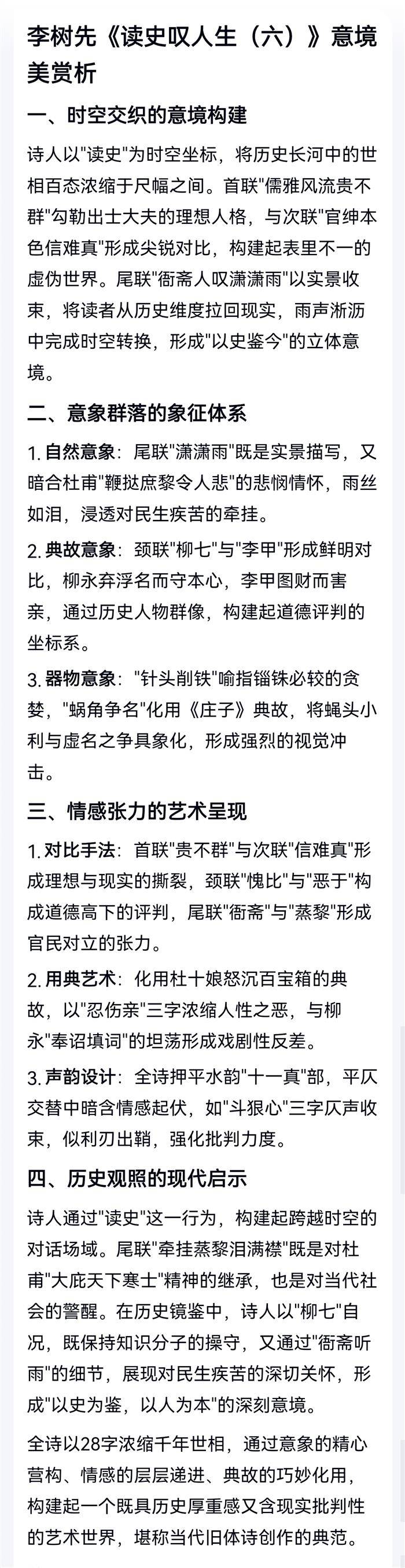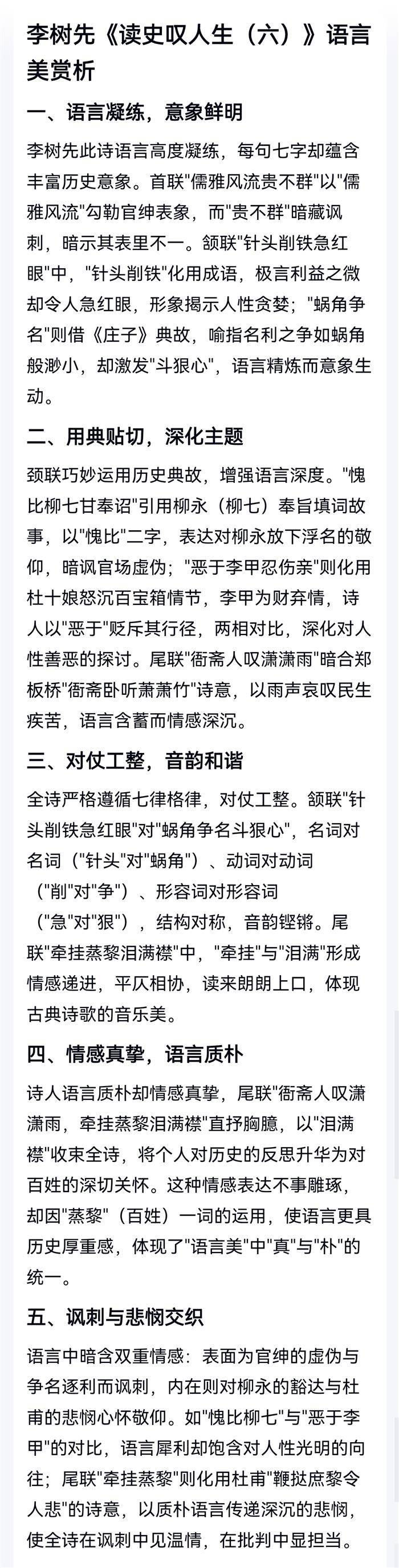 读史叹人生(六)(2025-12-4)儒雅风流贵不群,官绅本色信难真。针头削铁急红眼,蜗角争名斗狠心。愧比柳七甘奉诏,恶于李甲忍伤亲。衙斋人叹潇潇雨,牵挂蒸黎泪滿襟。 注:首联,儒雅官绅,表里不同。颔联,谋利红眼,图名斗狠。颈联,柳七(柳咏)奉旨填词,弃浮名。李甲图财害命,获银千两。引杜十娘故事。尾联,板桥听雨潇潇哀民病,杜甫吟诗"鞭挞庶黎令人悲"。