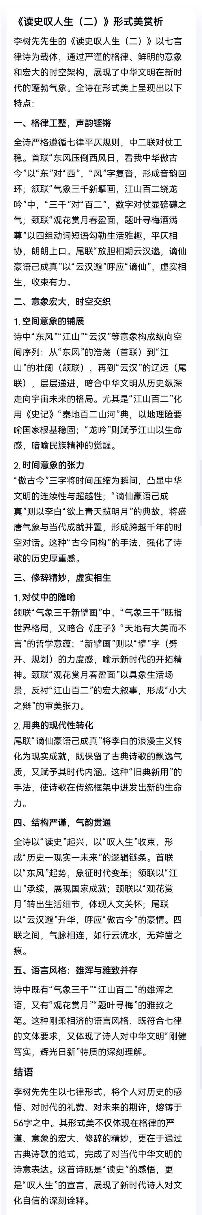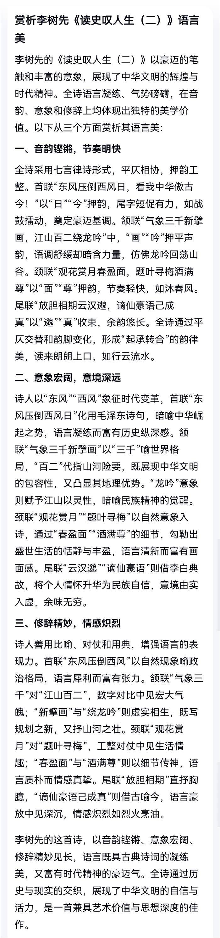 读史叹人生(二)东风压倒西风日,看我中华傲古今!气象三千新擘画,江山百二绕龙吟。观花赏月春盈面,题叶寻梅酒满尊。放胆相期云汉邈,谪仙豪语己成真。 注:首联,东风浩荡,啸傲古今。颔联,江山百二,气象三千。三千,指世界。颈联,看我今日中华,四季如诗如画。尾联,太白云汉之期,今日成真。 Al赏析二则