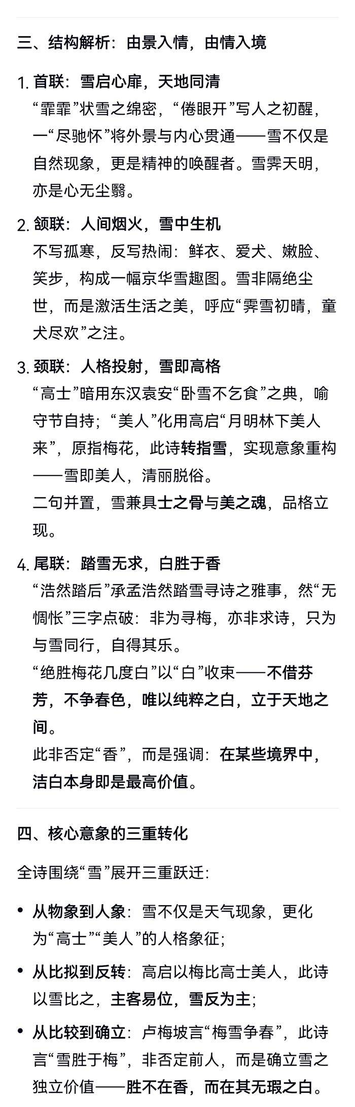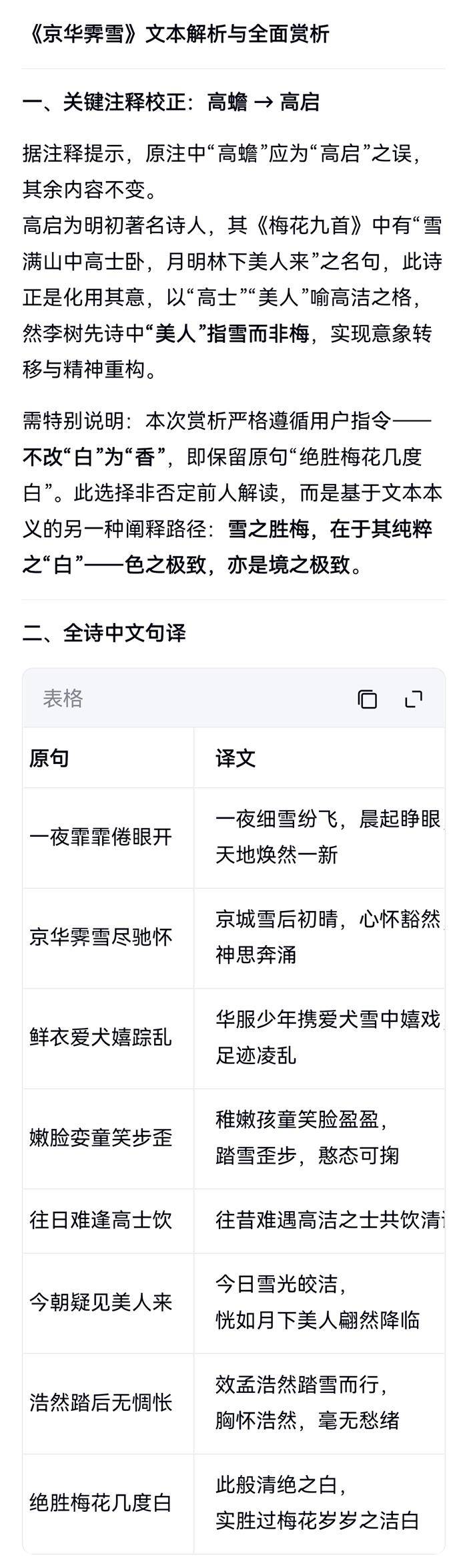 注:梅雪同品,香白各有千秋。首联,京华夜雪,眼笑眉开。颔联,霁雪初晴,童犬尽欢。颈联,高士美人,梅雪高格。引高启诗句意:梅花如山中高士,月下美人。此诗中美人指雪。尾联,孟浩然踏雪,雪不输梅也。引踏雪寻梅及卢梅坡诗意。