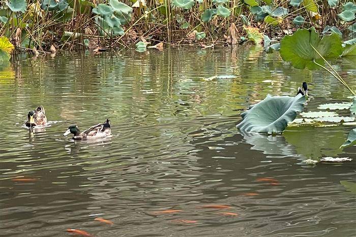 荷影横斜鸭照水,玉鳞潜没草浮苔。