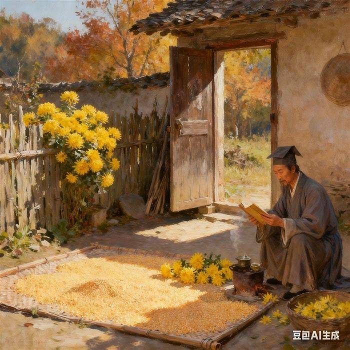 篱角黄花缀冷香,柴门半掩晒新粮。