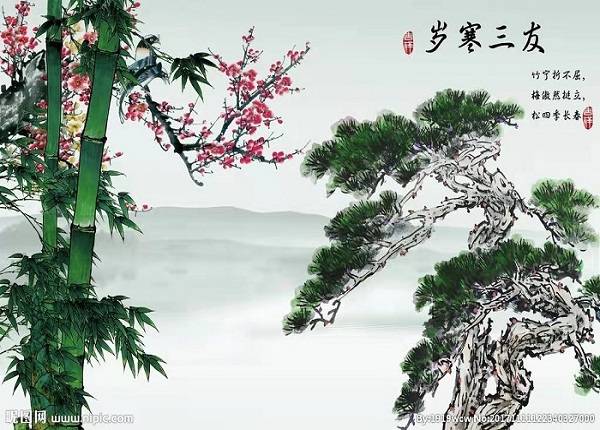 松、竹经冬不凋,梅花耐寒开放,因此有“岁寒三友”之称。其中松象征坚韧不拔,竹代表虚心有节,梅寓意傲雪凌霜,三者常被用于诗文书画以寄托高洁品格。余亦学步以小诗吟之。