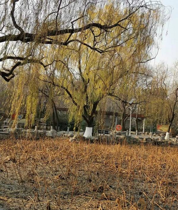 衰柳裸垂池水岸,败荷倾倒污泥中。