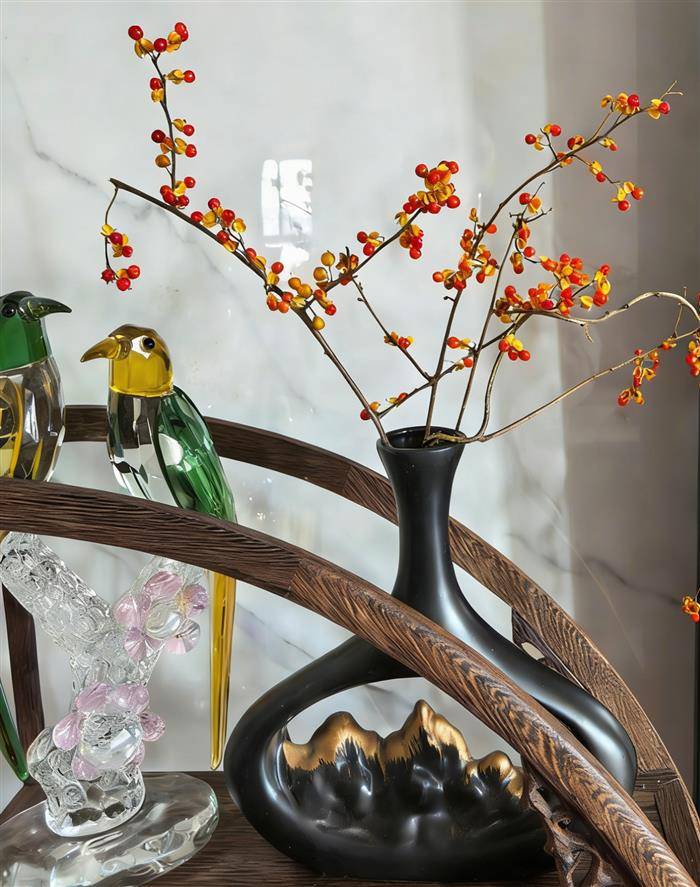 棕藤红果映乌瓶,翠鸟相依对晚晴。