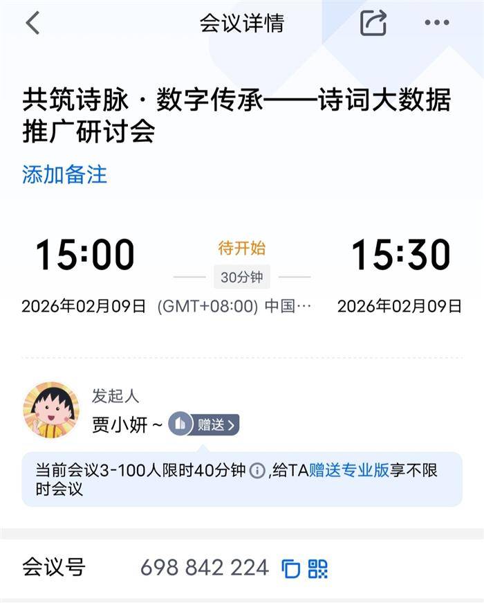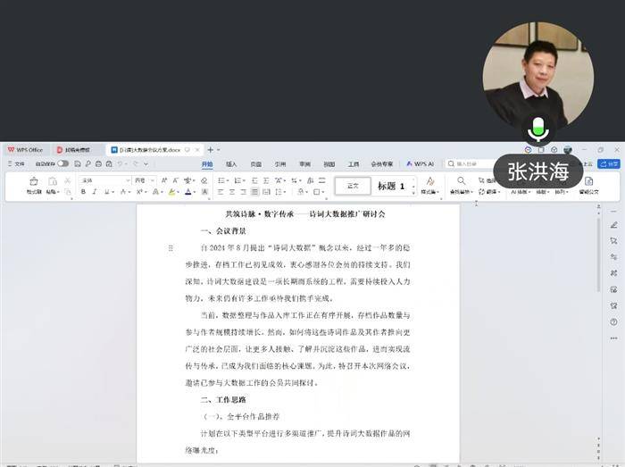 2026年2月9日下午,由中华诗词学会诗词云技术团队主办的“共筑诗脉·数字传承——诗词大数据推广研讨会”以线上形式顺利召开。本次研讨会由诗词云技术团队贾小妍发出邀请,中华诗词学会大数据事业部副主任张洪海主持会议,汇聚全国诗词大数据建设参与者共探传统文化数字化传承路径,四川省二木文斋青梧诗社社长张乐友受邀参会,代表青梧诗社为诗词大数据推广建言献策。