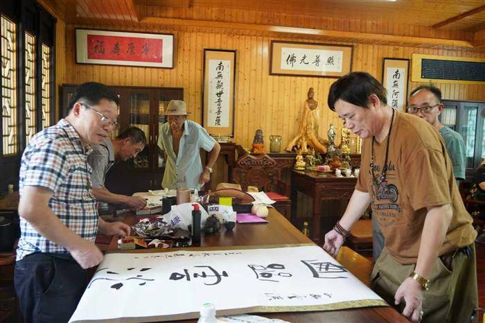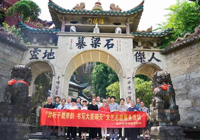 8月10日上午,温岭市诗词楹联协会组织诗友开展“聆听千载斧韵,书写大美硐天”文艺志愿活动。大家游览了原市道教协会所在地道源洞、硐天南兴教寺、长屿硐天八仙岩、花篮村颜家庙等景点,并在兴教寺开展了一场书法笔会,众诗友兴致勃勃,观天地之大美,感而咏之。