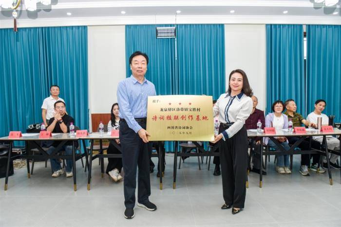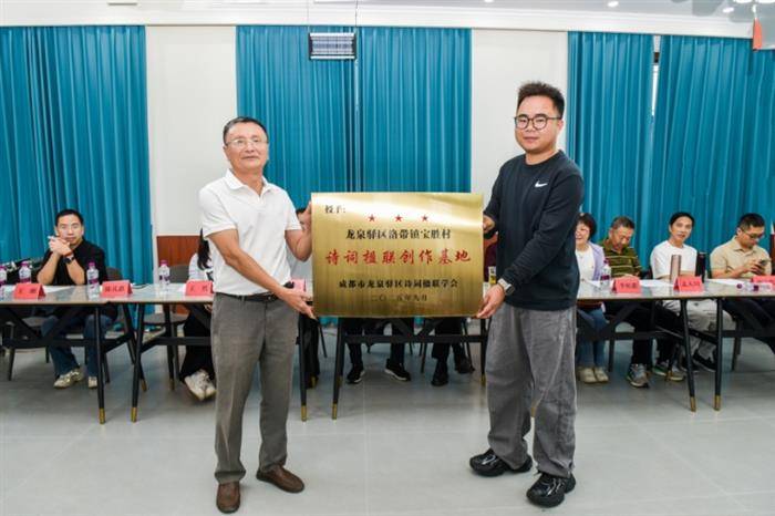 会上,省诗词协会副会长贾智德宣读了《关于在成都市龙泉驿区洛带镇宝胜村建立“诗词楹联创作基地”的复函》。邓建秋会长向宝胜村授予“四川省诗词协会诗词楹联创作基地”牌。省诗词协会副会长、龙泉驿区诗词楹联学会会长苏飞授予“龙泉驿区诗词楹联学会宝胜村诗词楹联创作基地”牌。陈礼惠书记代表宝胜村接牌。