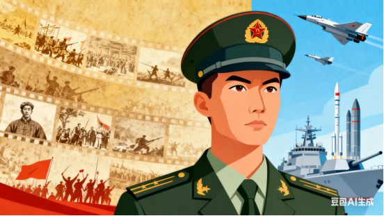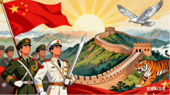 旌旗雷动锋芒露,砺剑强邦,铸盾安疆。守护和平盛世昌。