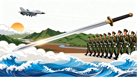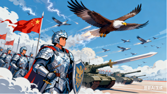长剑横空,铁翼撕云,壮气贯虹。看三军列阵,山河肃立;银鹰掠日,天海翻汹。步撼雷霆,光寒星斗,八帙峥嵘砺刃锋。凝眸处,正龙骧虎啸,傲视苍穹。