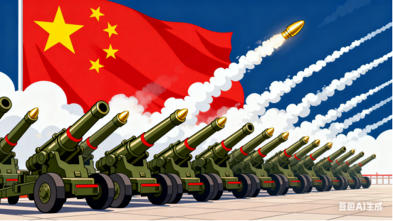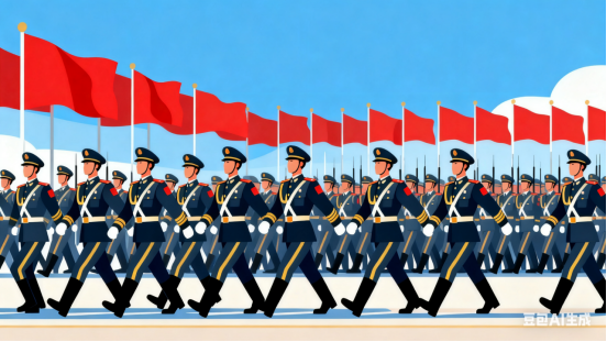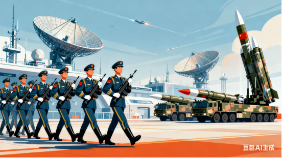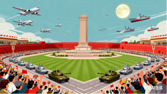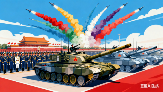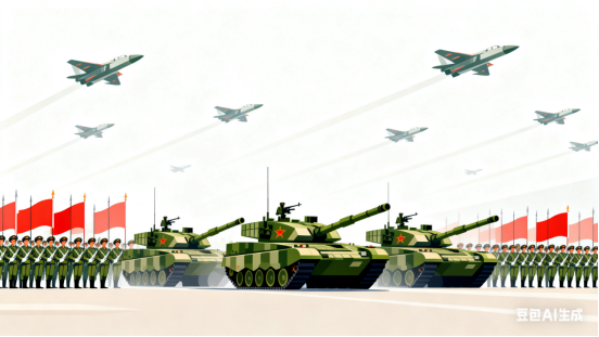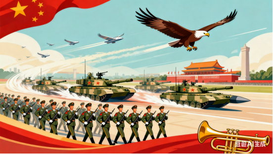 礼炮齐鸣震四方,三军方阵步铿锵。银鹰呼啸穿云过,铁甲轰鸣动地长。