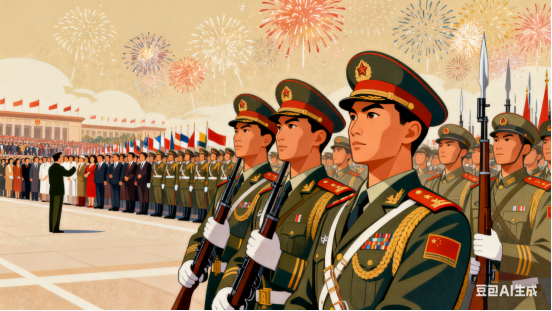 方队整齐坚定,英姿飒爽忠诚。来宾首脑好心情,大气中国可敬!
