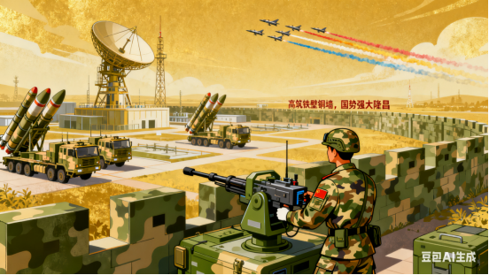 导弹昂然列阵,战鹰矫健穿空。国之重器固长城,看我中华强盛。”