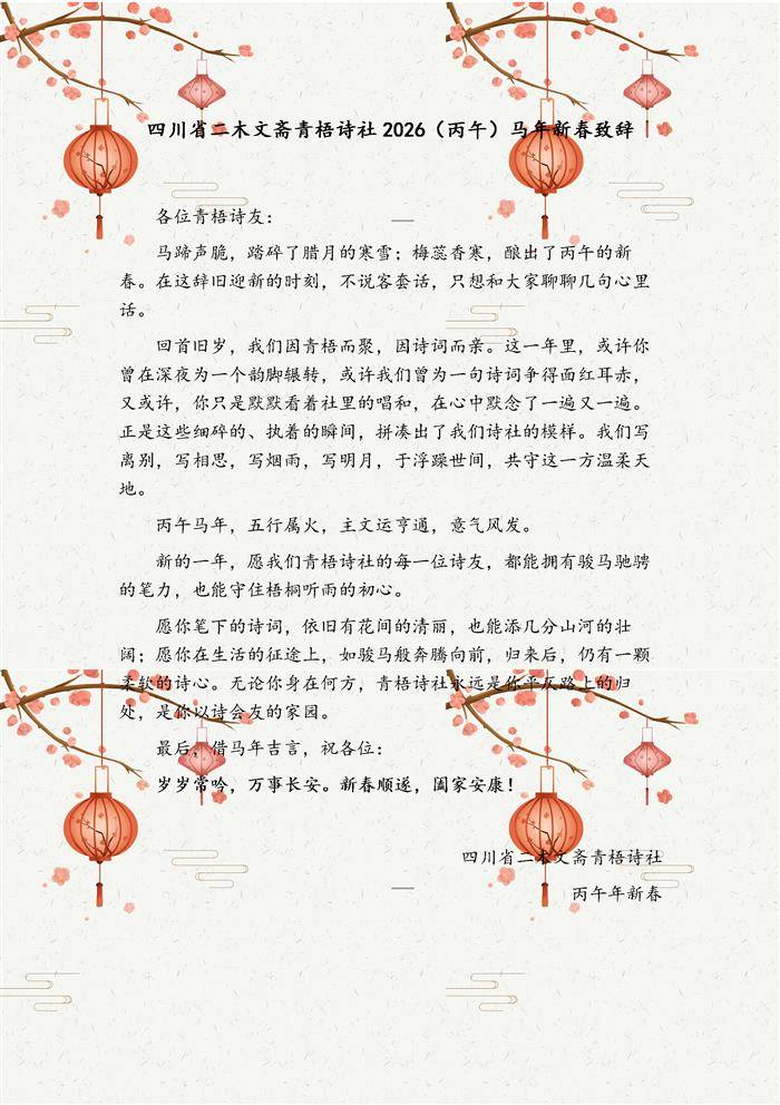 四川省二木文斋青梧诗社2026(丙午)马年新春致辞