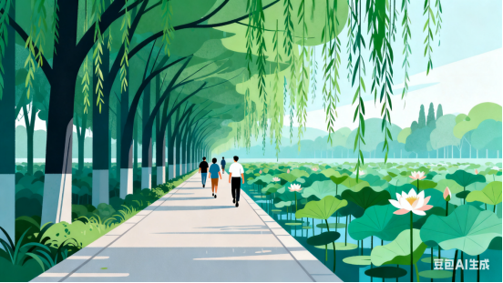 雨霁风清,步道幽长。谈笑间、已过林廊。柳丝摇曳,荷芰浮香。看日初升,塔倒影,水浮光。
