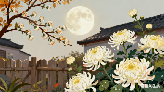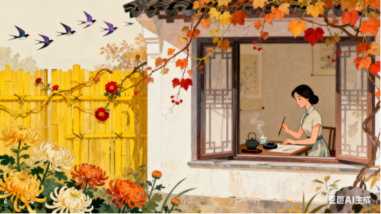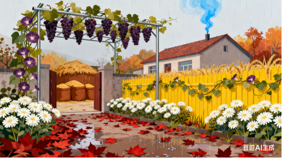 雨后潇潇红叶,门前处处菊花。牵牛藤蔓绕篱笆,秋色风光如画。